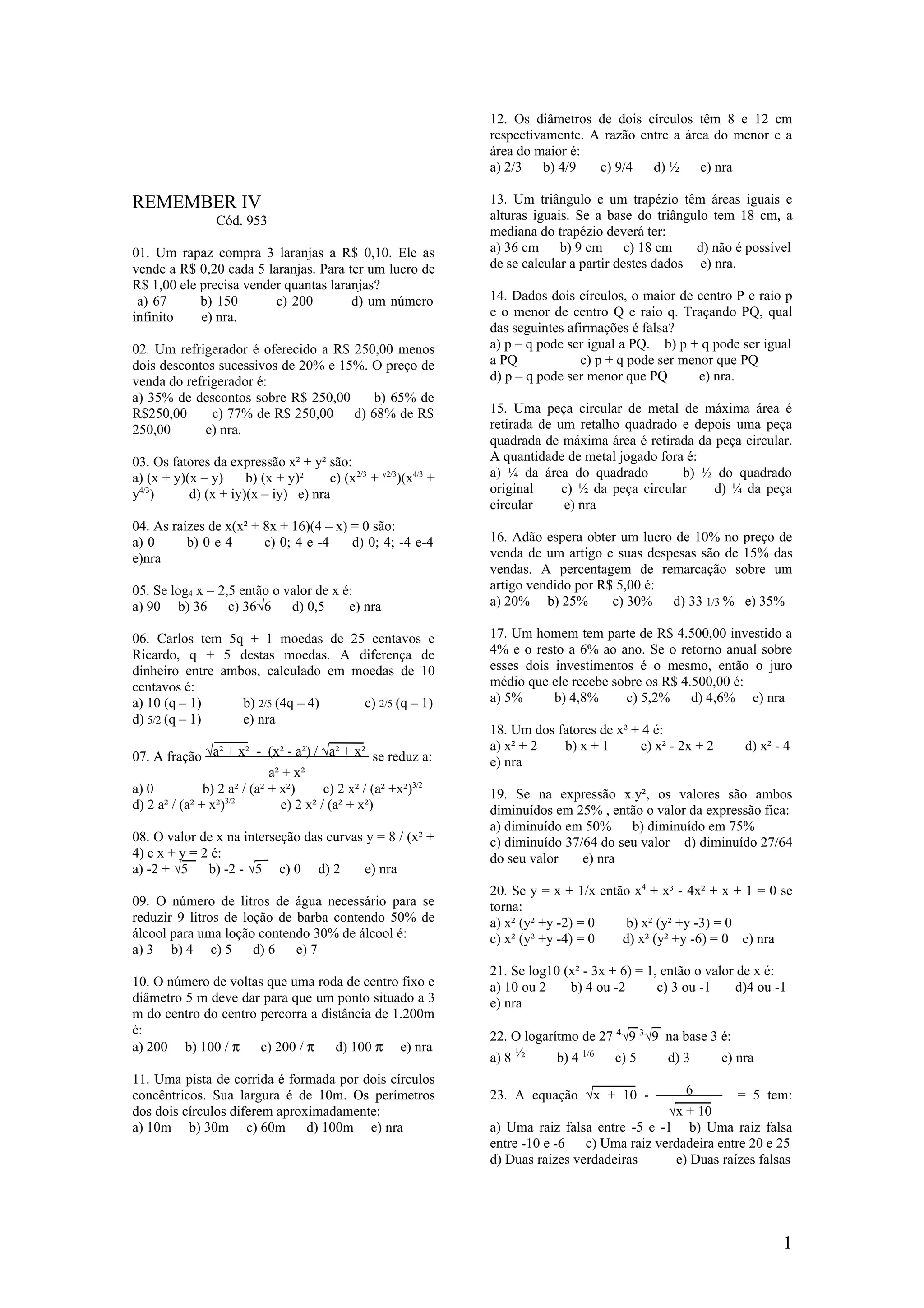 03. Os fatores da expressão x² + y² são: A quantidade de metal jogado fora é: