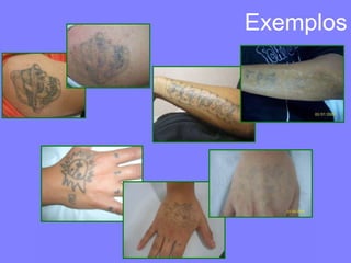 O documento discute a remoção de tatuagem a laser, que é realizada em sessões a cada 30 dias. A sessão dura cerca de 1 minuto para cada 3cm de tatuagem e causa dor aproximadamente 5 vezes maior do que tatuar. É recomendado aplicar um anestésico tópico 45 minutos antes e usar pomada cicatrizante por pelo menos 7 dias após cada sessão, evitando exposição solar direta na área tratada.