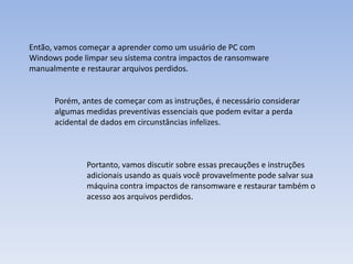 O documento fornece instruções em 5 etapas para remover o ransomware Saved (Scarab) de um sistema infectado e restaurar arquivos criptografados, incluindo reiniciar no modo de segurança, remover processos maliciosos, remover entradas do registro, usar o Shadow Explorer para restaurar arquivos de backup e usar ferramentas de descriptografia ou recuperação de dados caso outras opções falhem.