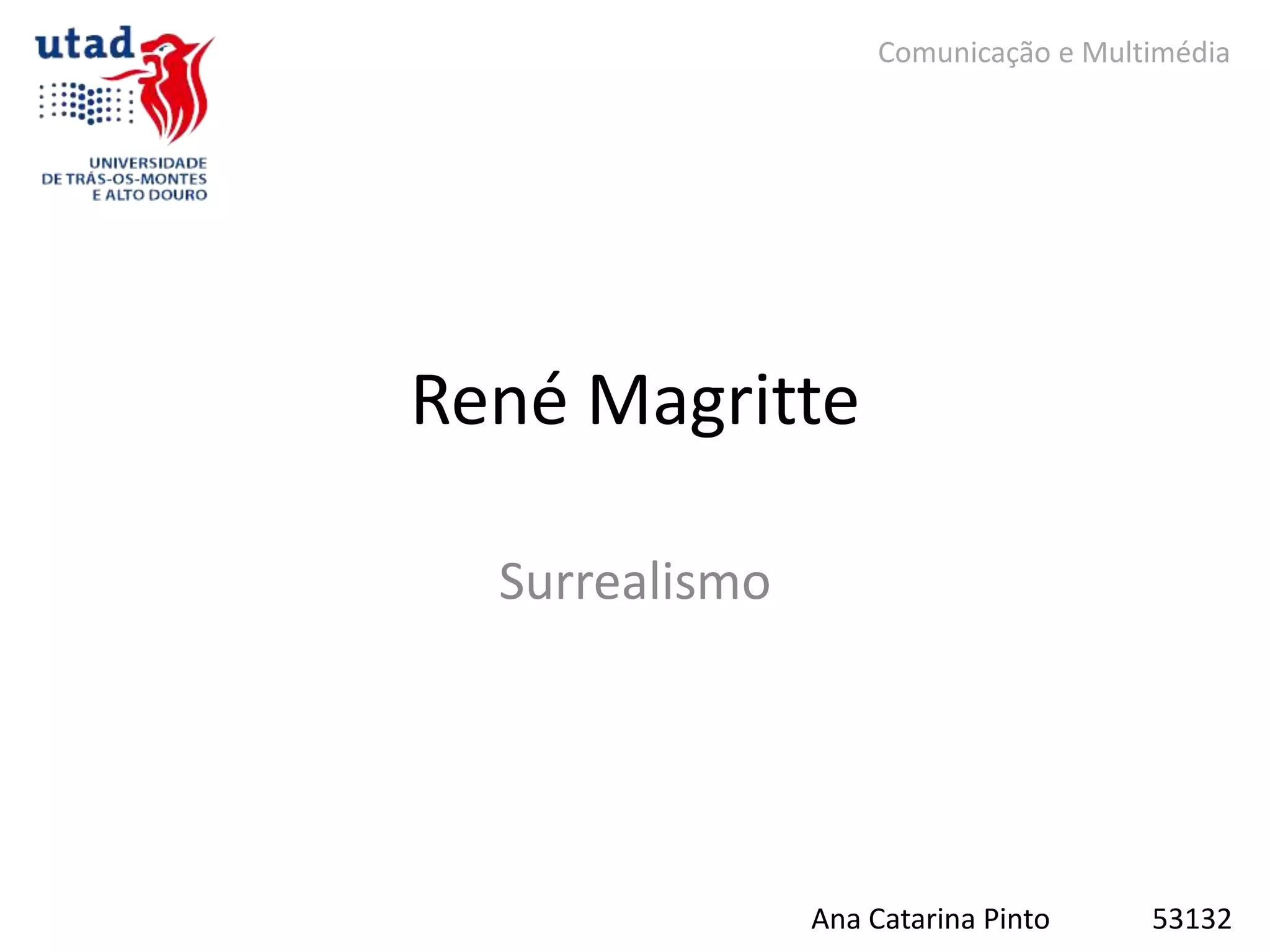 O documento discute o movimento artístico surrealismo e o pintor belga René Magritte, um dos principais expoentes desse estilo. O surrealismo surgiu em Paris na década de 1920 e buscava expressar o mundo do inconsciente e dos sonhos através da arte. As obras de Magritte, como "A traição das imagens" e "The Son of Man", questionavam a relação entre a imagem e o objeto representado de forma enigmática.