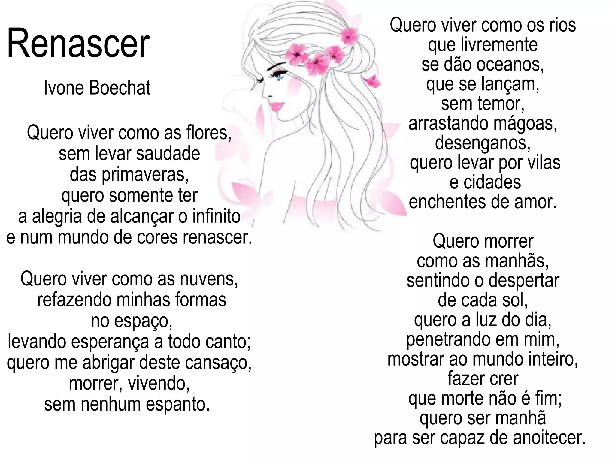 O poema expressa o desejo de viver livremente como os rios, morrer como as manhãs e renascer como as flores, nuvens e manhãs. O eu lírico quer levar amor por vilas e cidades, mostrar que a morte não é o fim e viver sem saudade, apenas com a alegria de alcançar o infinito e renascer em um mundo de cores.