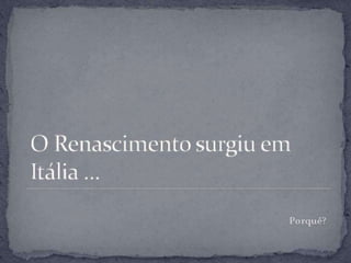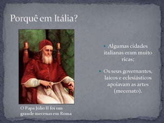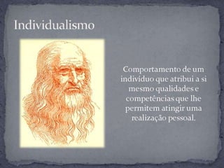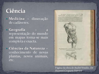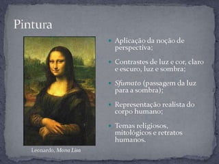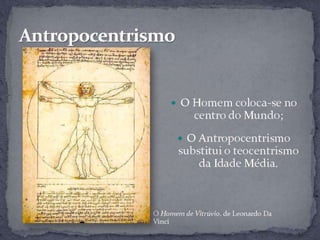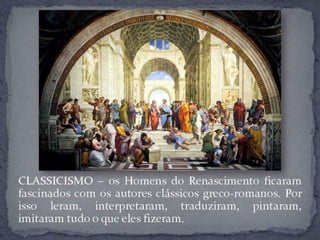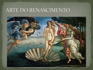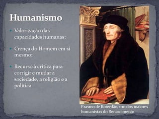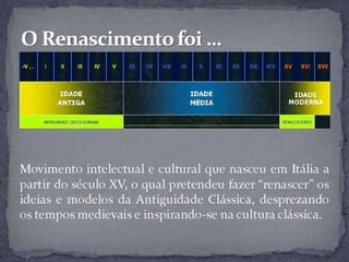 O documento descreve a invenção da imprensa de tipos móveis por Gutenberg no século XV e como isso permitiu a rápida impressão e disseminação de livros de forma mais barata, ajudando a propagar as ideias do Renascimento. Também lista alguns dos principais pensadores e artistas do período renascentista.