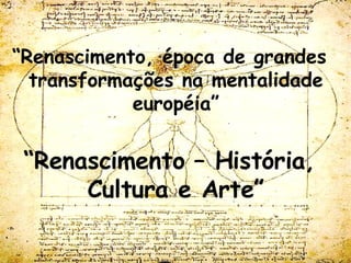 O documento descreve o Renascimento na Europa, dividindo-o em três fases principais: Trecento (século XIV), Quattrocento (século XV) e Cinquecento (século XVI). Apresenta características das artes, incluindo pintura, escultura e arquitetura neste período, com exemplos de obras e artistas importantes como Botticelli, Leonardo da Vinci, Rafael e Michelangelo.
