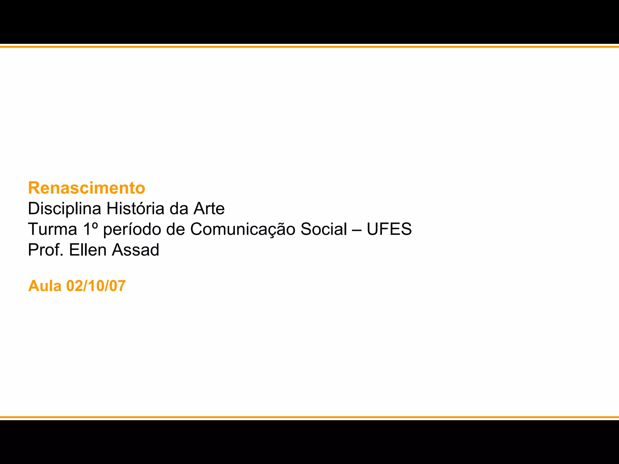 O documento resume os principais aspectos do Renascimento na Itália, desde o contexto histórico e social até as características e principais artistas deste período. O Renascimento teve início na Itália no século XIV, impulsionado pelo crescimento econômico e das cidades, e valorizou o humanismo, o racionalismo e o classicismo inspirado na cultura greco-romana. Artistas como Botticelli, Donatello, Leonardo da Vinci e Michelangelo revolucionaram a pintura, escultura e arquitetura, bus