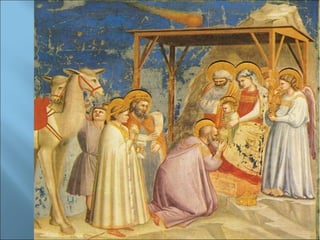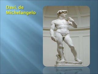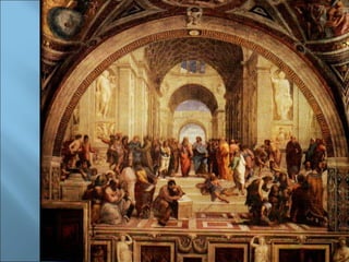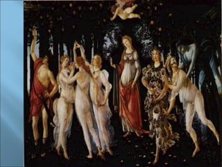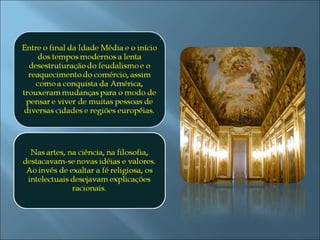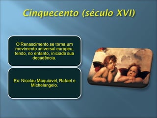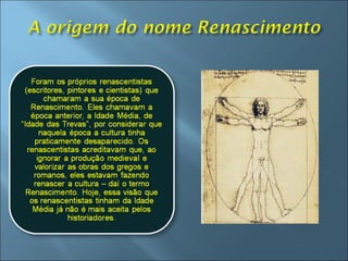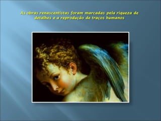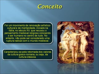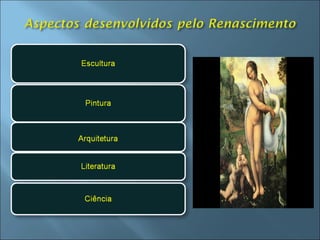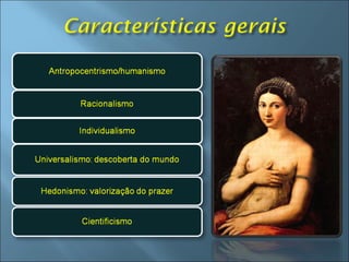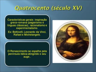 O documento descreve os principais aspectos do Renascimento na Europa, como o surgimento do humanismo após a queda de Constantinopla, o mecenato das cidades italianas e a valorização da razão e da vida terrena pelos humanistas. Destaca também grandes nomes desse período como Brunelleschi, Da Vinci, Michelangelo, Botticelli e Rafael.