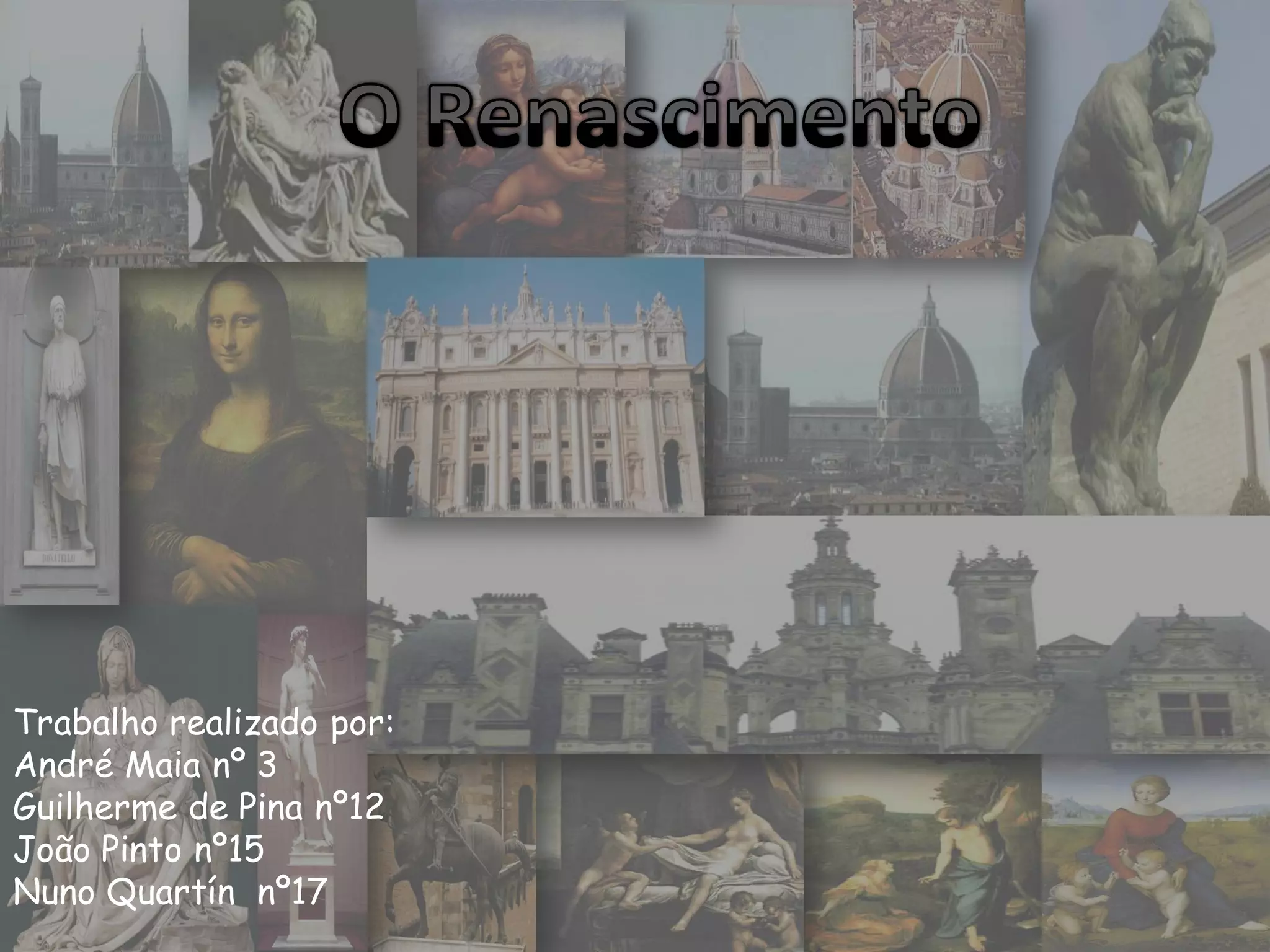 O documento descreve as características principais da arquitetura, escultura e pintura do Renascimento. A arquitetura renascentista se inspirou nos modelos clássicos da Grécia e Roma, com elementos como colunas, frontões e cúpulas. Na escultura, Miguel Ângelo se destacou por seu naturalismo e estudos anatômicos. Na pintura, a composição em pirâmide foi frequente e havia maior preocupação com o naturalismo. Leonardo da Vinci foi uma figura central do período.
