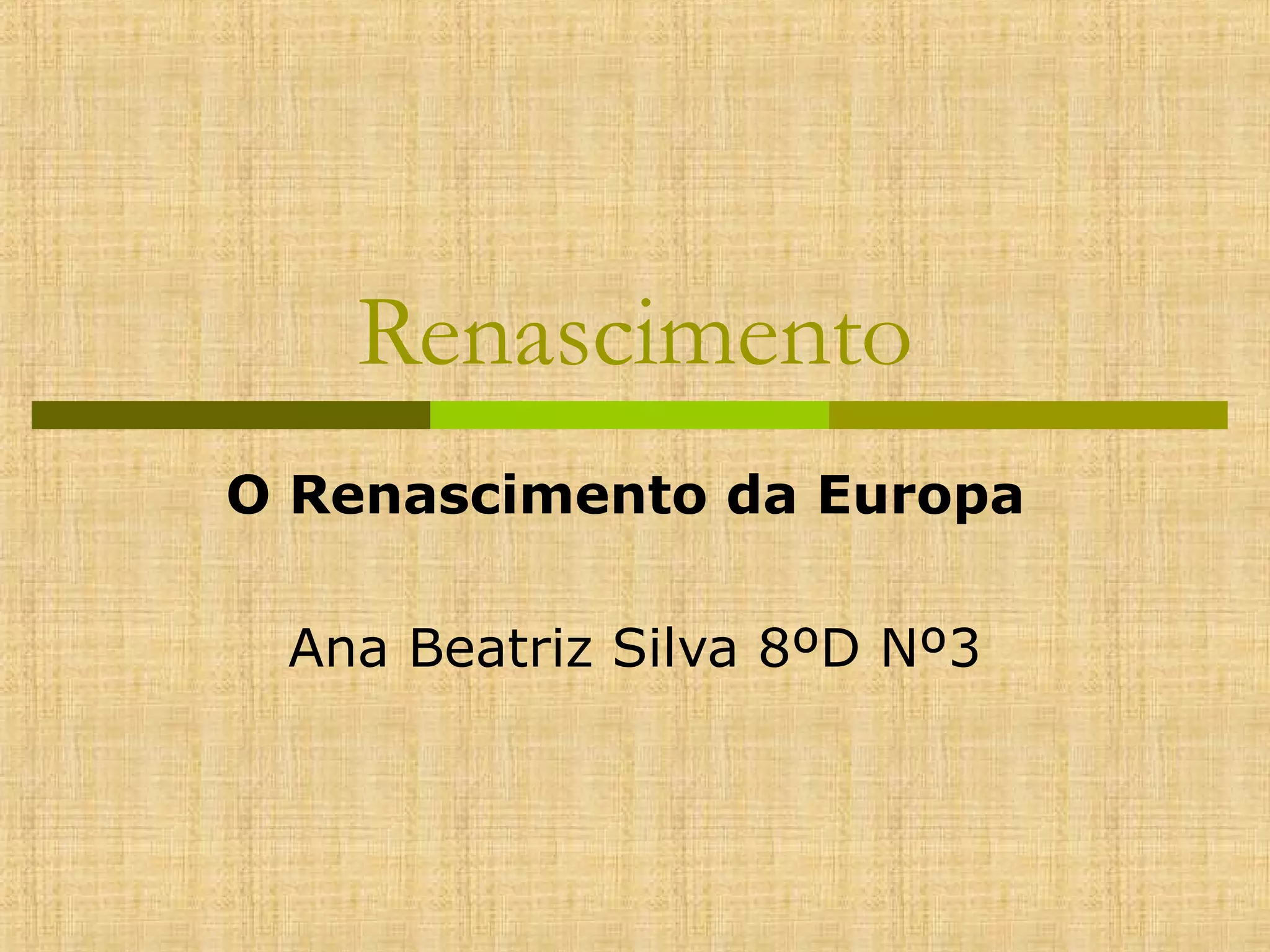 O documento descreve o Renascimento na Europa, um período entre os séculos XIV-XVI caracterizado por uma renovação cultural influenciada pela retomada da cultura clássica da Grécia e Roma. Marcou a transição do Feudalismo para o Capitalismo e viu o surgimento de uma classe burguesa, cidades, universidades e novas formas de expressão artística e pensamento como o Iluminismo.