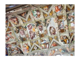 O Renascimento representou transformações entre 1300-1650 valorizando o homem e a natureza. Artistas como Botticelli, Leonardo da Vinci, Michelângelo e Rafael se destacaram. O Barroco surgiu no século 17 trazendo emoção à arte através de Caravaggio, Artemisia e Velázquez. No Brasil, Aleijadinho se destacou em obras como o Santuário do Bom Jesus de Matosinhos.