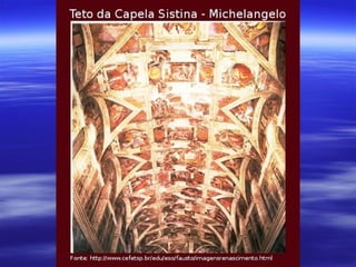 O documento discute os principais conceitos do Renascimento e do Humanismo, incluindo o antropocentrismo, racionalismo, individualismo, hedonismo e inspiração na antiguidade clássica. O Renascimento valorizou o homem e sua capacidade de raciocínio, colocando-o no centro, em contraste com a Idade Média que via o homem como subordinado à Igreja.
