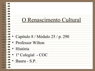 O documento descreve o Renascimento Cultural na Europa, definindo-o como um período de renovação das artes e do pensamento entre a Idade Média e a Idade Moderna. A Itália foi o berço deste movimento, que se caracterizou pelo humanismo, racionalismo, universalismo e experimentalismo. Artistas como Leonardo da Vinci e Miguelangelo floresceram neste período, assim como cientistas como Copérnico, que questionaram ideias medievais e iniciaram a revolução científica.