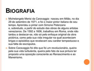 Michelangelo Merisi da Caravaggio foi um pintor italiano do século XVI conhecido por seu estilo realista e uso dramático de luz e sombra. Ele pintou muitas obras religiosas populares baseadas em pessoas comuns, focando nos rostos. Uma de suas obras primas foi A Ceia em Emaús, caracterizada por tons escuros e feixes de luz.