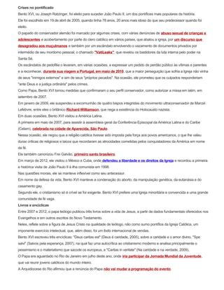 O Papa Bento XVI renunciou ao pontificado em 28 de fevereiro devido à idade avançada e falta de forças para exercer o cargo. Sua renúncia surpreendeu a todos e levantou questionamentos sobre os últimos anos de seu pontificado, marcados por escândalos e corrupção dentro da Igreja Católica.