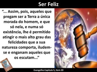 O documento discute vários temas relacionados à felicidade, julgamentos, culpa e fé. A felicidade verdadeira vem de dentro e de uma atitude positiva, não das circunstâncias externas. Devemos evitar julgar outras pessoas e, em vez disso, colocar-nos no lugar delas. A culpa do passado não deve paralisar o presente; devemos seguir em frente. A fé, mesmo pequena como um grão de mostarda, pode mover montanhas.