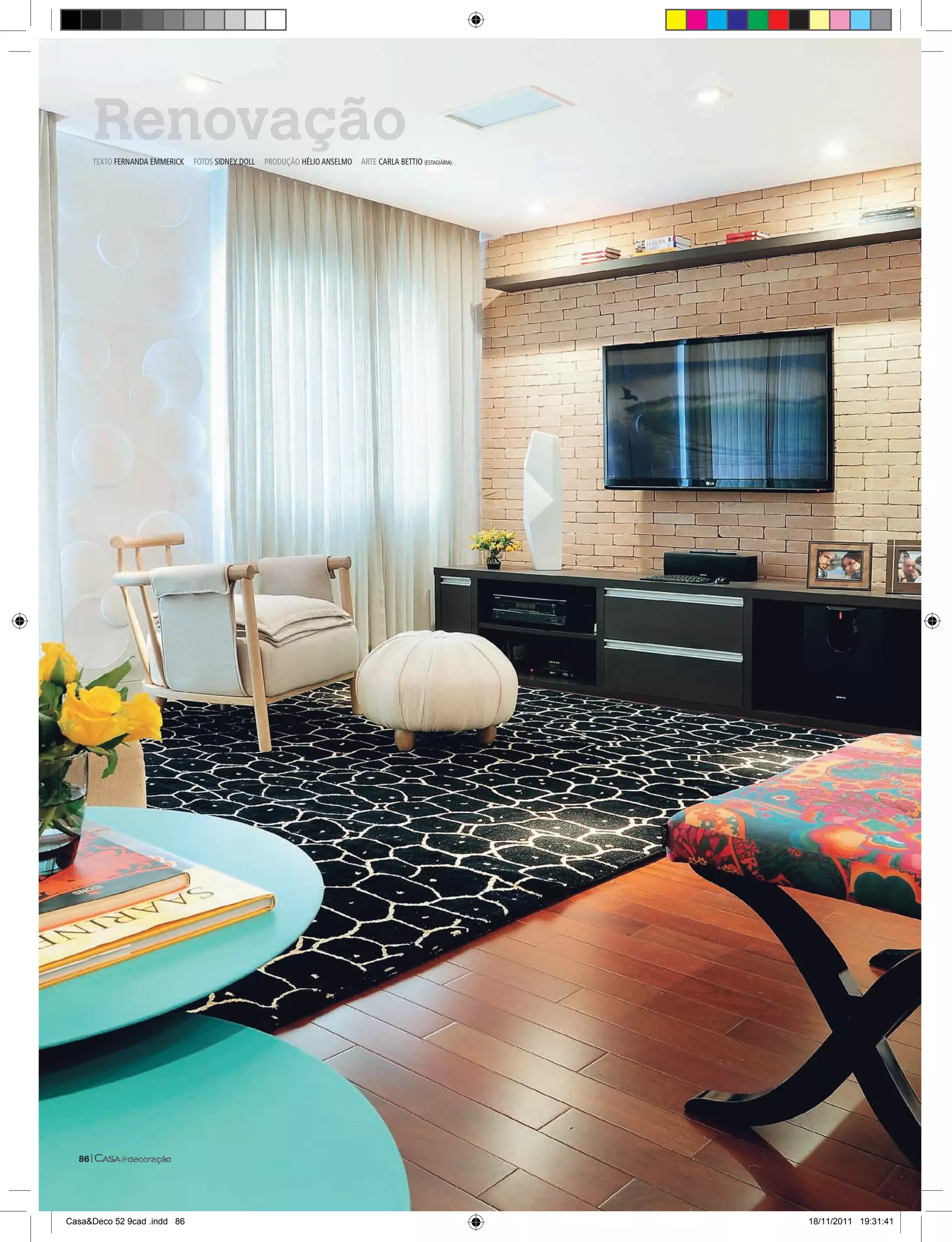 Este documento descreve a renovação feita por arquitetos de um apartamento de um casal em São Paulo. O casal decorou o apartamento sozinho antes, mas queria dar um upgrade. Os arquitetos trouxeram novas ideias como substituir poltronas por uma só, adicionar um tapete colorido e movimentar os móveis para abrir mais espaço. As mudanças deixaram o lar mais aconchegante e moderno.
