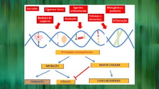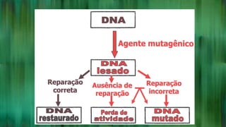 O documento discute os mecanismos de reparo do DNA em células, incluindo reparo direto, fotorreatividade enzimática, reparo por excisão de base e nucleotídeos, e reparo pós-replicação. Também aborda mutações, doenças causadas por deficiências no reparo do DNA, e a habilidade única dos tardígrados de sobreviver a estresses extremos por meio da transferência horizontal de genes.