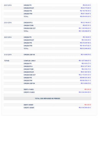 Este documento fornece um demonstrativo da distribuição da arrecadação do Fundo de Manutenção e Desenvolvimento da Educação Básica e Valorização dos Profissionais da Educação (FUNDEB) em Barcarena, Pará, entre 6 de janeiro e 31 de janeiro de 2014. Nele constam as datas, as origens dos valores (impostos, transferências da União e dos estados) e os montantes distribuídos no período, totalizando um crédito de R$5.542.804,09 ao FUNDEB.