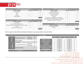 O documento resume os planos de ação estratégicos, projetos e desempenho dos processos das diferentes diretorias da Federação no mês de outubro de 2012. As diretorias de Desenvolvimento e Vice-Presidência não tiveram novos planos de ação, enquanto a Presidência teve um desempenho ótimo nos processos. A Comunicação superou as expectativas e a Administrativo-Financeira teve resultados prejudicados pela saída do diretor.