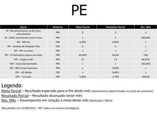 O relatório mensal da presidência apresenta os resultados parciais dos indicadores e marcos estratégicos. Alguns indicadores não atingiram as metas parciais ou não possuem resultados devido à coleta única ser realizada no fim do ano. Os projetos de diagnóstico de RH, processo de PE e sistema de gestão estão em andamento, com riscos de atrasos em algumas etapas. As equipes de gestão e eventos apresentam altos níveis de satisfação e comprometimento.