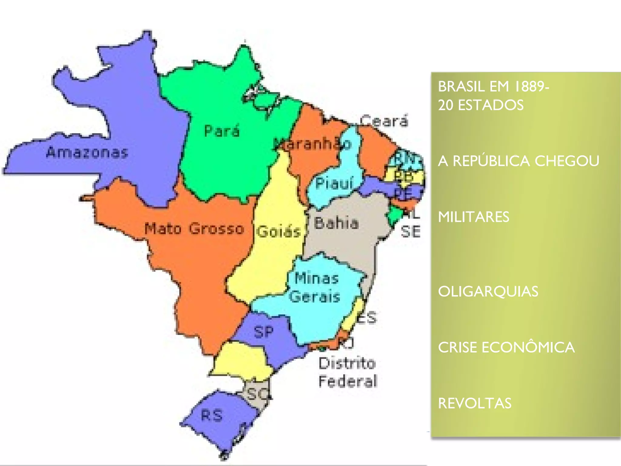 O documento descreve o período da República Velha no Brasil entre 1889 e 1930. Foi um período de instabilidade política dominado por oligarquias regionais e militares, com crises econômicas frequentes. Dividiu-se em República da Espada (1889-1894) e República Oligárquica (1894-1930), caracterizada por alianças entre militares e fazendeiros de café e o coronelismo.