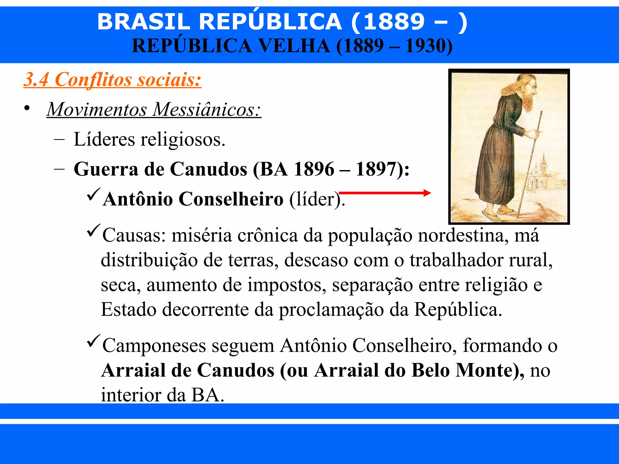 A República Velha no Brasil (1889-1930) foi marcada por conflitos sociais, como a Guerra de Canudos e a Coluna Prestes, e movimentos como a Semana de Arte Moderna. A crise econômica de 1929 enfraqueceu os governos oligárquicos, levando à Revolução de 1930 e ao fim da República Velha com a ascensão de Getúlio Vargas à presidência.