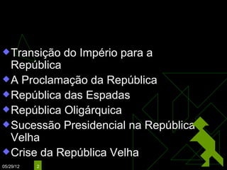 O documento descreve os principais aspectos da República Velha no Brasil, incluindo a transição do Império para a República em 1889, os governos provisório e constitucional iniciais, a Constituição de 1891 e os conflitos políticos da época. Também aborda os governos subsequentes até 1914, destacando questões como a política do café com leite e revoltas como a da Chibata em 1910.