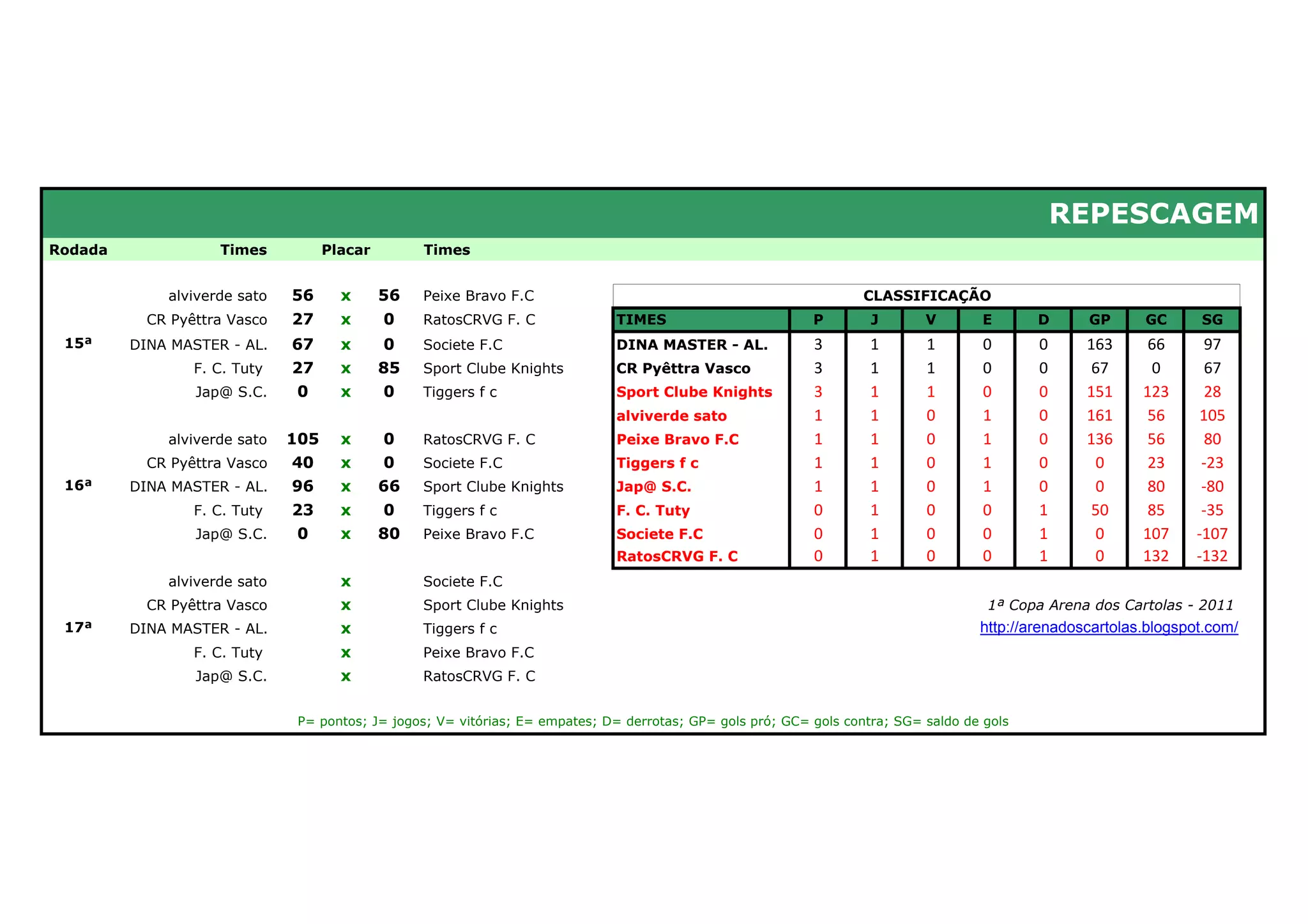 Este documento apresenta os resultados de duas rodadas de um campeonato de futebol entre times fictícios. Na 15a rodada, o DINA MASTER-AL venceu o Societe F.C. por 67 a 0 e lidera a classificação. Na 16a rodada, o DINA MASTER-AL venceu o Sport Clube Knights por 96 a 66. A tabela mostra os dados dos times após as duas rodadas, como pontos, jogos, vitórias, empates e saldo de gols.
