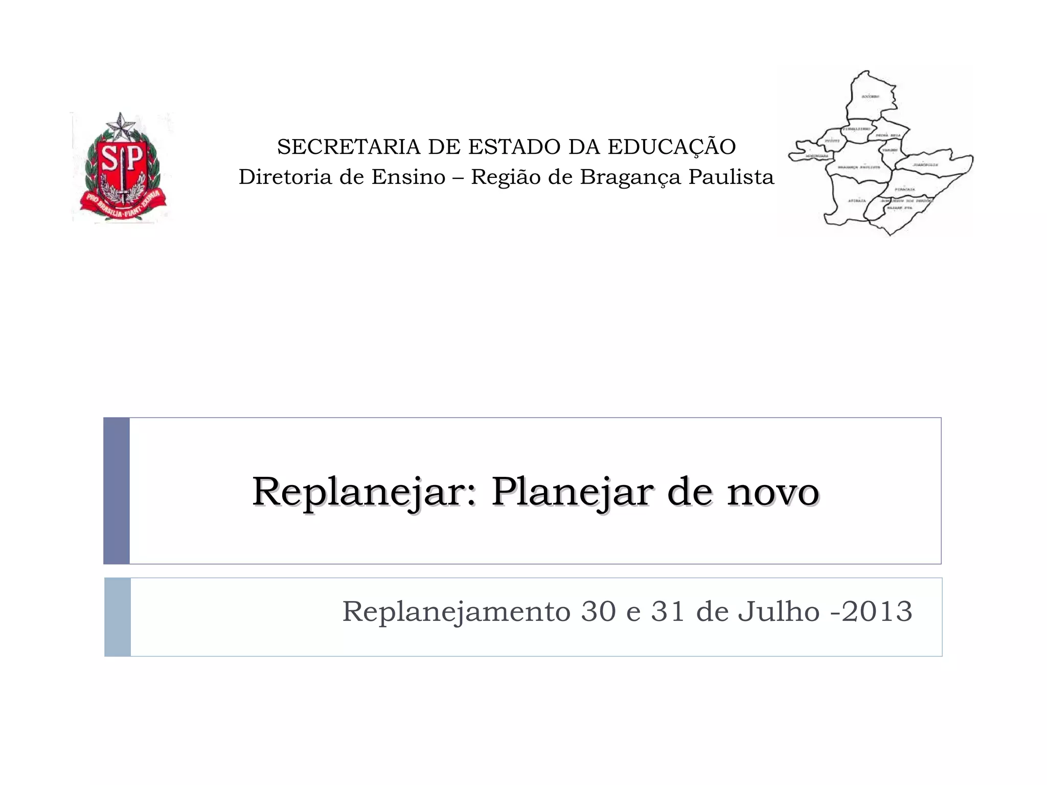 O documento descreve um replanejamento de atividades educacionais realizado pela Secretaria de Educação em 30 e 31 de julho de 2013. O replanejamento visa retomar as metas educacionais, acompanhar a evolução do aprendizado dos alunos, avaliar as condições de ensino e rever projetos planejados, definindo um novo plano de ação.