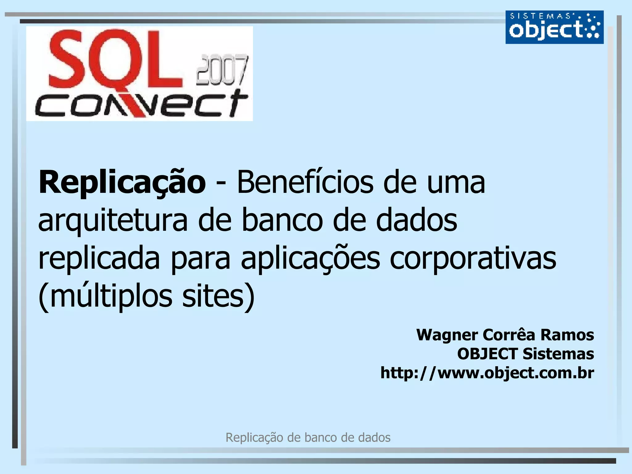 O documento discute os benefícios da arquitetura de banco de dados replicada para aplicações corporativas em múltiplos sites. Apresenta conceitos de replicação e classifica softwares replicadores. Discute como evitar inconsistências na replicação assíncrona multi-master e fornece dicas de modelagem de dados. Apresenta dois casos práticos de replicação usando o software Object MMRS.