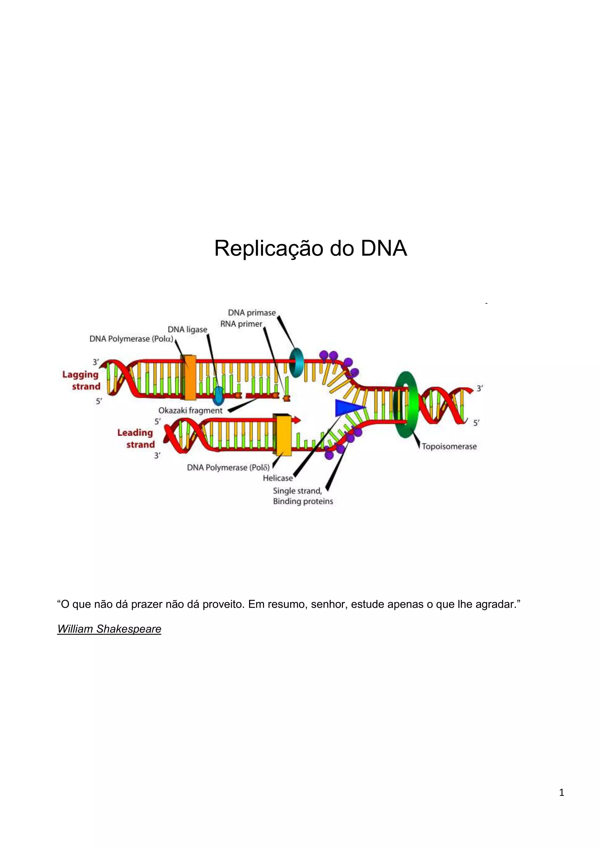 A replicação do DNA ocorre na fase S da interfase e segue um mecanismo semiconservativo, onde cada filamento original gera um novo filamento complementar. Em eucariotos, a replicação inicia com a formação de um pré-RC na origem de replicação, que recruta as enzimas necessárias para a deselicoidização do DNA e síntese dos novos filamentos, de forma contínua e descontínua. A telomerase é responsável pela replicação das pontas dos cromossomos para evitar seu encurtamento a cada divisão celular