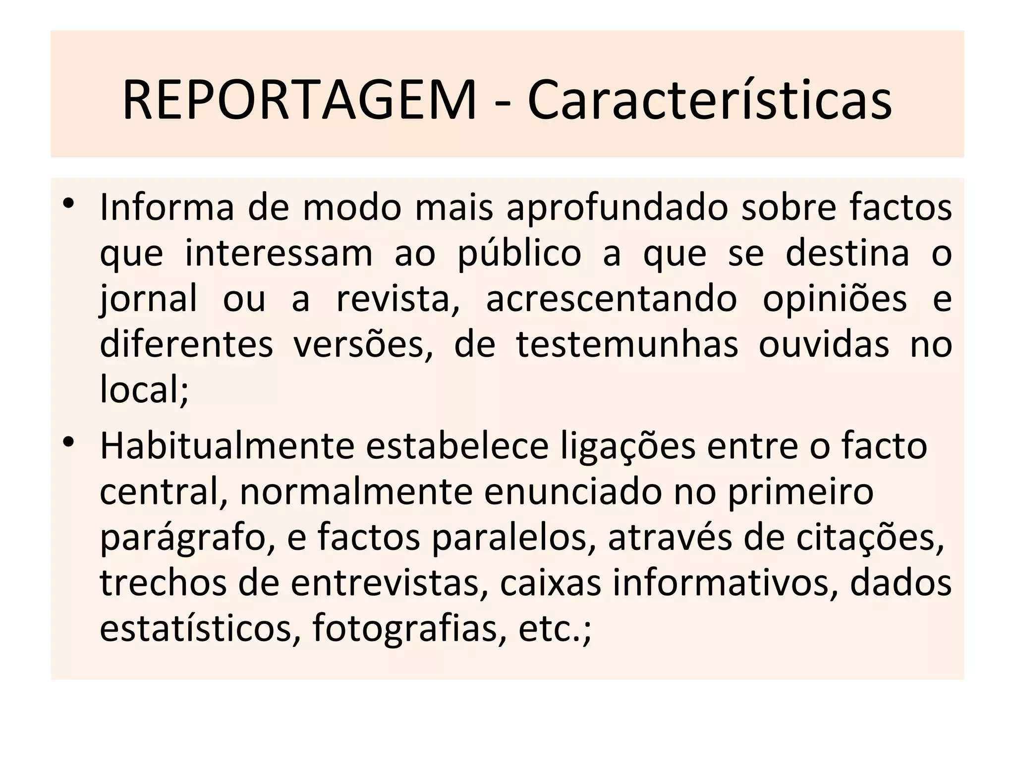 A reportagem fornece informações detalhadas sobre fatos de interesse para o público-alvo, acrescentando opiniões e versões de testemunhas. Ela estabelece conexões entre o fato principal e fatos relacionados por meio de citações, entrevistas e dados. A reportagem pode ter um caráter opinativo ao questionar as causas e efeitos dos fatos e orientar os leitores. Ela usa uma linguagem objetiva e direta.
