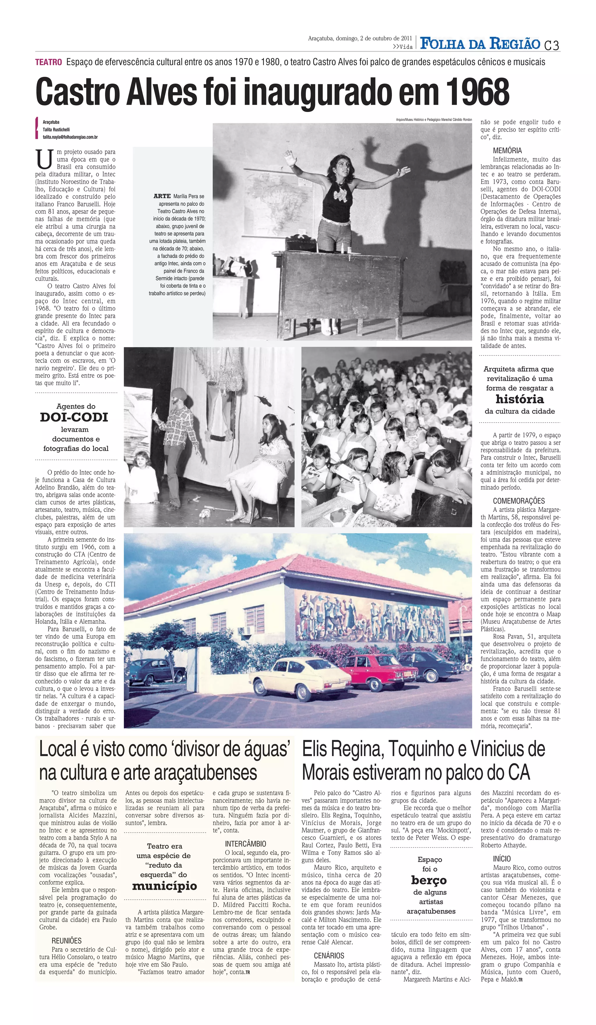 O teatro Castro Alves de Araçatuba foi um importante espaço cultural entre 1970-1980, recebendo grandes espetáculos e músicos. Construído pelo italiano Franco Baruselli como parte do Instituto Intec, o local promovia intercâmbio artístico e cursos, sendo um ponto de encontro da esquerda na época da ditadura militar. Após período de abandono, o teatro passou por revitalização.