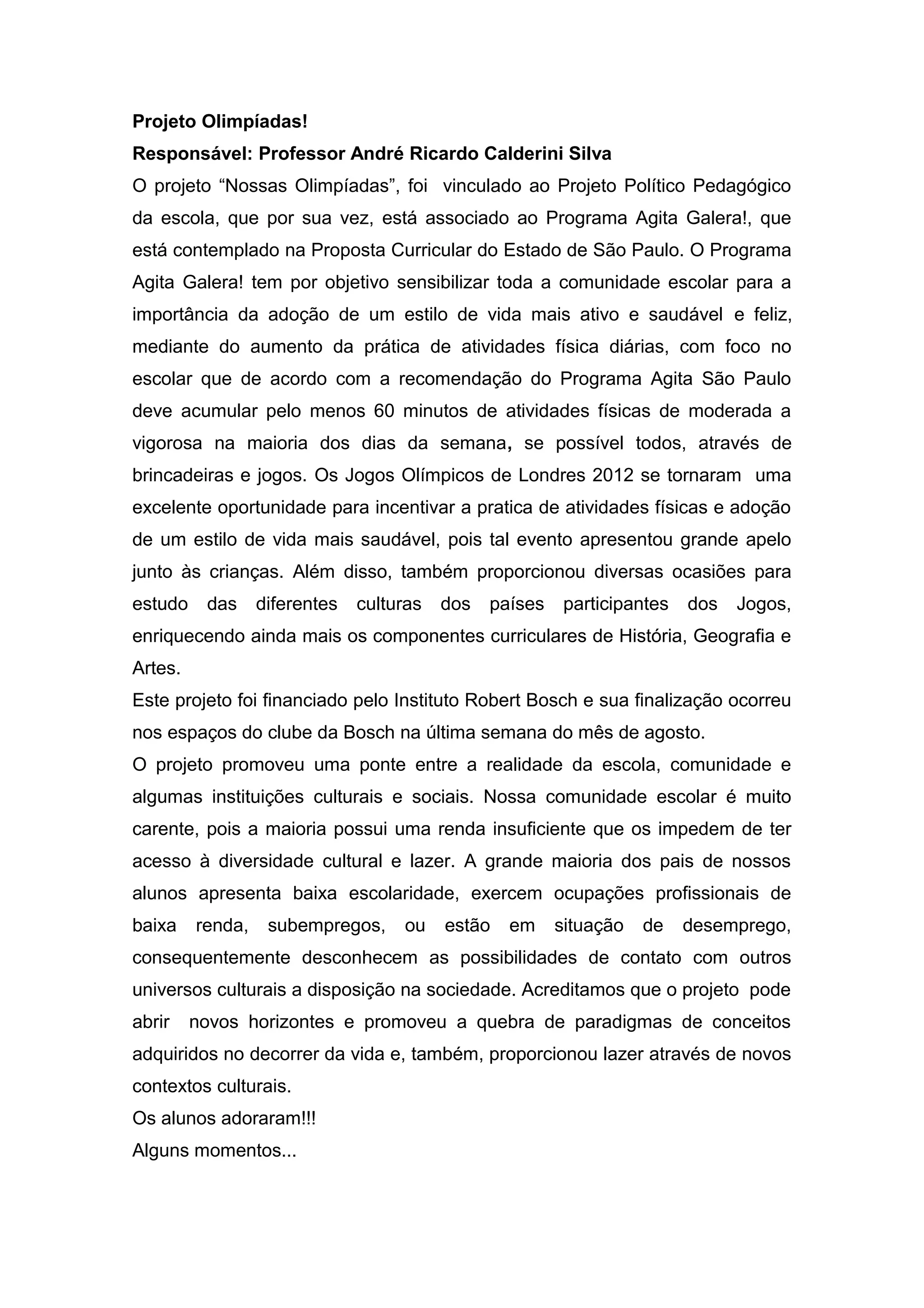 O projeto "Nossas Olimpíadas" teve como objetivo promover um estilo de vida saudável e ativo entre a comunidade escolar através da prática de atividades físicas inspiradas nos Jogos Olímpicos de 2012. O projeto também buscou expandir os horizontes culturais dos alunos e quebrar paradigmas, uma vez que a maioria deles vive em situação de pobreza com pouco acesso à cultura e lazer. O projeto foi financiado pelo Instituto Robert Bosch e ocorreu nos espaços do clube da