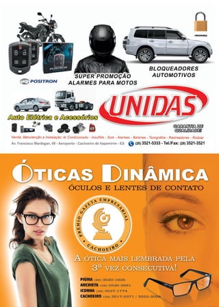 O documento é uma edição de um periódico chamado Repórter Capixaba. Contém notícias locais, anúncios de empresas, frases inspiradoras e fotos de pessoas da comunidade. A edição inclui um editorial do editor, matérias sobre lançamentos de veículos, eventos sociais e culturais recentes, e anúncios de diversos negócios da região.