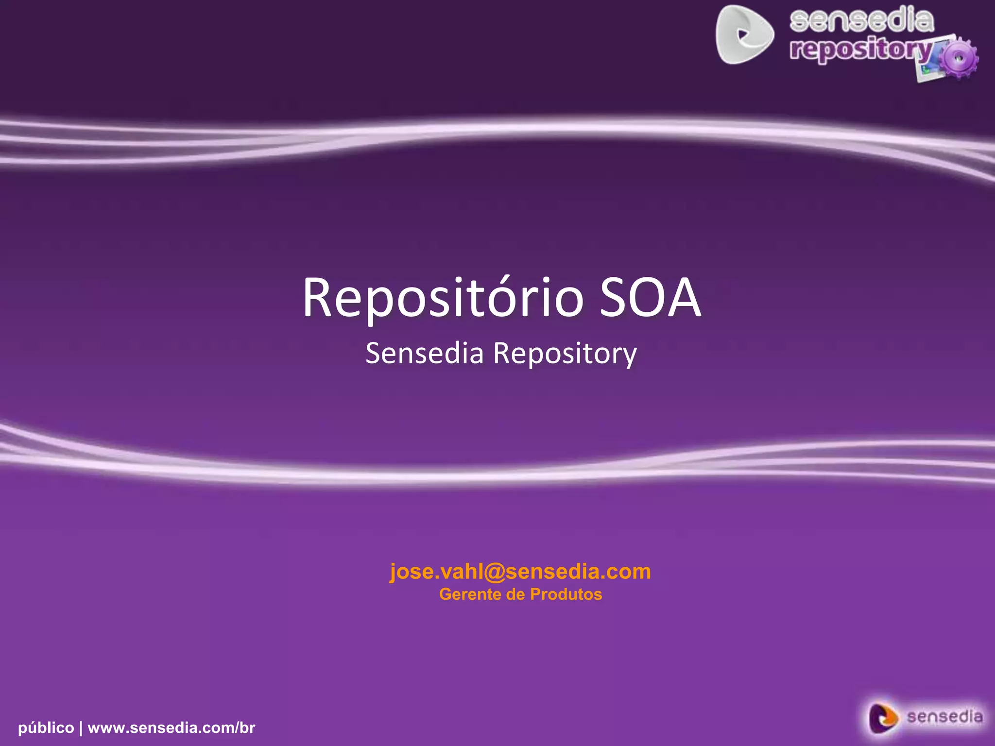 O documento descreve o Sensedia Repository, uma solução para gerenciar ativos de software como serviços, componentes e frameworks através de governança SOA. Ele fornece funcionalidades como gerenciamento de metadados, ciclo de vida, pesquisa, colaboração e relatórios para promover o reúso de ativos e medir o retorno sobre investimento.