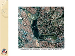 O documento discute representações do espaço geográfico através de mapas. Explica que mapas são representações gráficas da superfície terrestre e como são construídos a partir de fotografias aéreas, imagens de satélite e visitas in loco. Também descreve as partes de um mapa, convenções cartográficas, e tipos de mapas como políticos, físicos e demográficos.