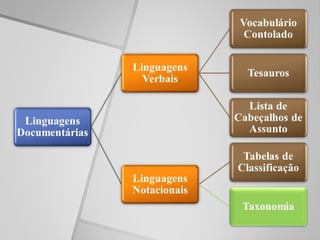 O documento apresenta as linguagens documentárias utilizadas na representação da informação em Biblioteconomia. Apresenta os objetivos de linguagens como classificações, taxonomias e tesauros na organização de acervos e recuperação da informação de forma sistemática. Também expõe os tipos de linguagens documentárias verbais e notacionais e seus instrumentos como lista de cabeçalhos de assunto, vocabulários controlados e tesauros.