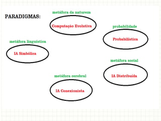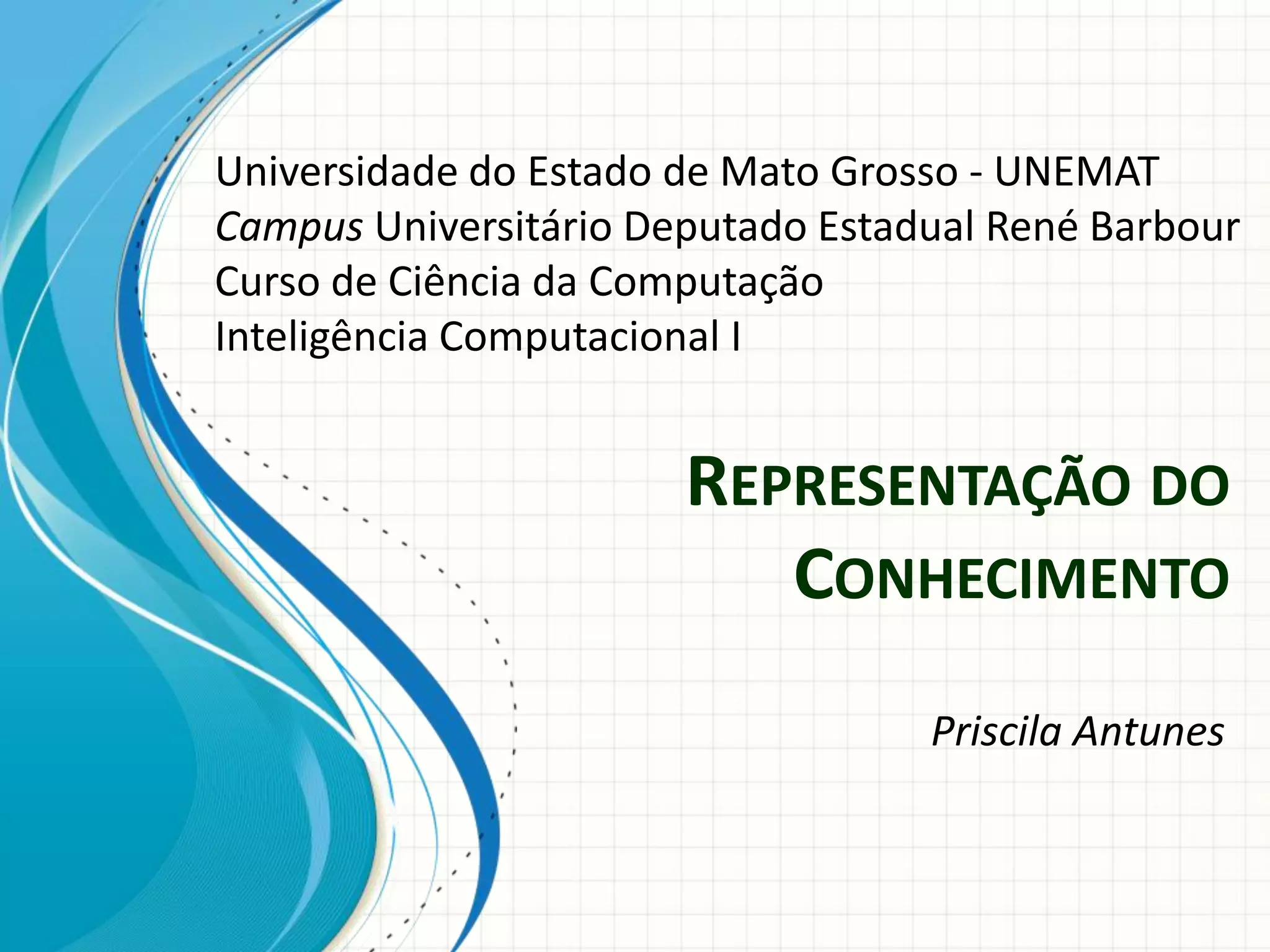 Este documento discute os principais conceitos de representação do conhecimento em inteligência artificial, incluindo formas de representar conhecimento como objetos, proposições, teoremas e algoritmos. Também aborda paradigmas como regras de produção, frames e casos, explicando como cada um estrutura e representa conhecimento de forma diferente.