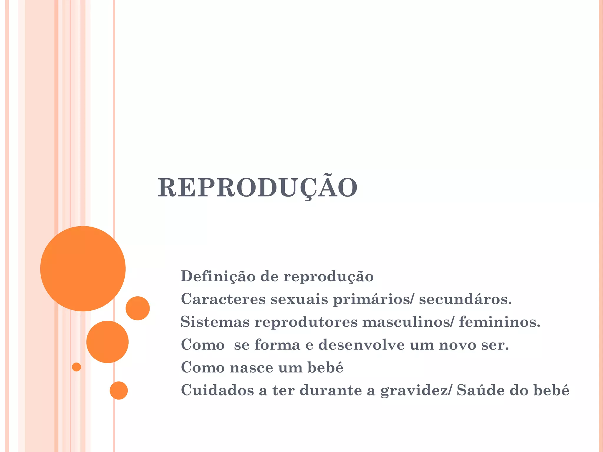 O documento descreve os sistemas reprodutores masculino e feminino, incluindo os órgãos sexuais e as células reprodutivas. Explica o processo de reprodução, desde a fecundação até ao nascimento, passando pela gestação e desenvolvimento do feto. Refere também a importância dos cuidados com os bebés recém-nascidos.
