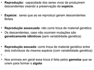 2) Existem duas formas de reprodução: assexuada, onde os descendentes são geneticamente idênticos, e sexuada, que traz variabilidade genética através da troca de material entre dois indivíduos.