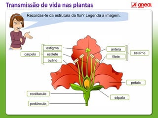 O documento descreve os principais órgãos reprodutores das plantas com flores e o processo de reprodução sexuada, incluindo a polinização, fecundação, frutificação, disseminação e germinação. Explica que as flores contêm os órgãos masculinos (estames) e femininos (carpelos) que produzem pólen e óvulos, e que a polinização envolve a transferência de pólen entre as anteras e o estigma.