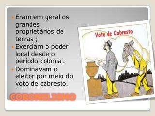 A República do Café-com-Leite (1896-1930) foi dominada pelas oligarquias de São Paulo e Minas Gerais. O coronelismo garantia o poder local destas elites através do voto de cabresto. A economia focava na exportação e valorização do café.