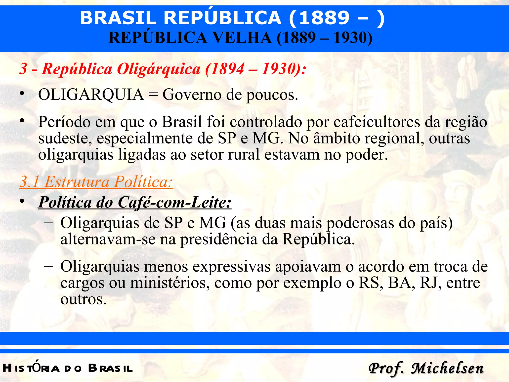 Este documento descreve o período da República Oligárquica no Brasil de 1894 a 1930. Foi um período em que o país foi controlado por oligarquias de cafeicultores das regiões sudeste, especialmente de São Paulo e Minas Gerais. A política e economia giravam em torno da produção e exportação do café. O coronelismo e fraudes eleitorais também eram comuns nesta época.