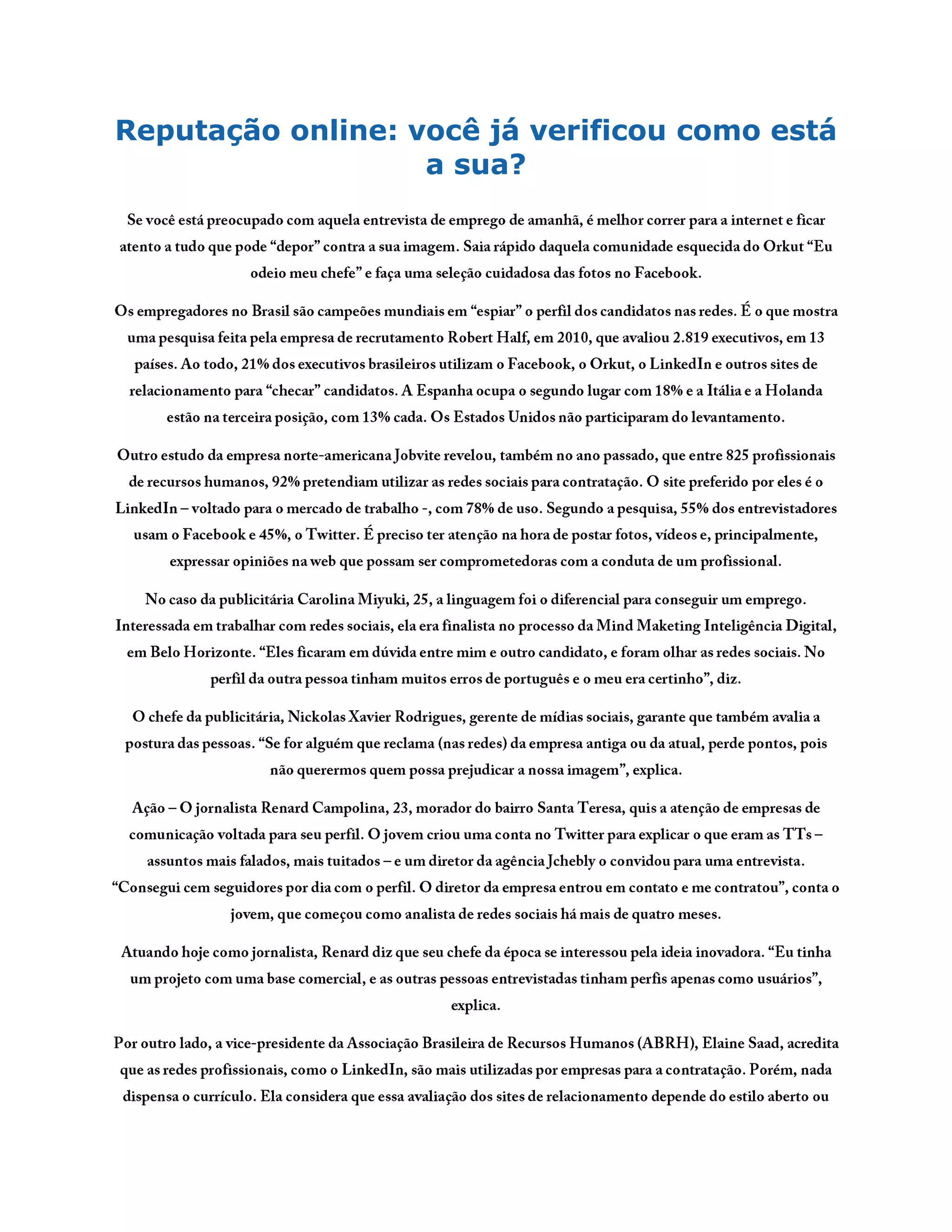 O documento discute a importância da reputação online na busca por empregos, ressaltando que 21% dos executivos brasileiros verificam perfis de candidatos nas redes sociais. Pesquisas mostram que 92% dos profissionais de recursos humanos utilizam essas plataformas para contratações, com o LinkedIn sendo o mais popular. Além disso, a necessidade de monitorar a imagem digital é destacada, pois más referências podem levar à rejeição durante processos seletivos.