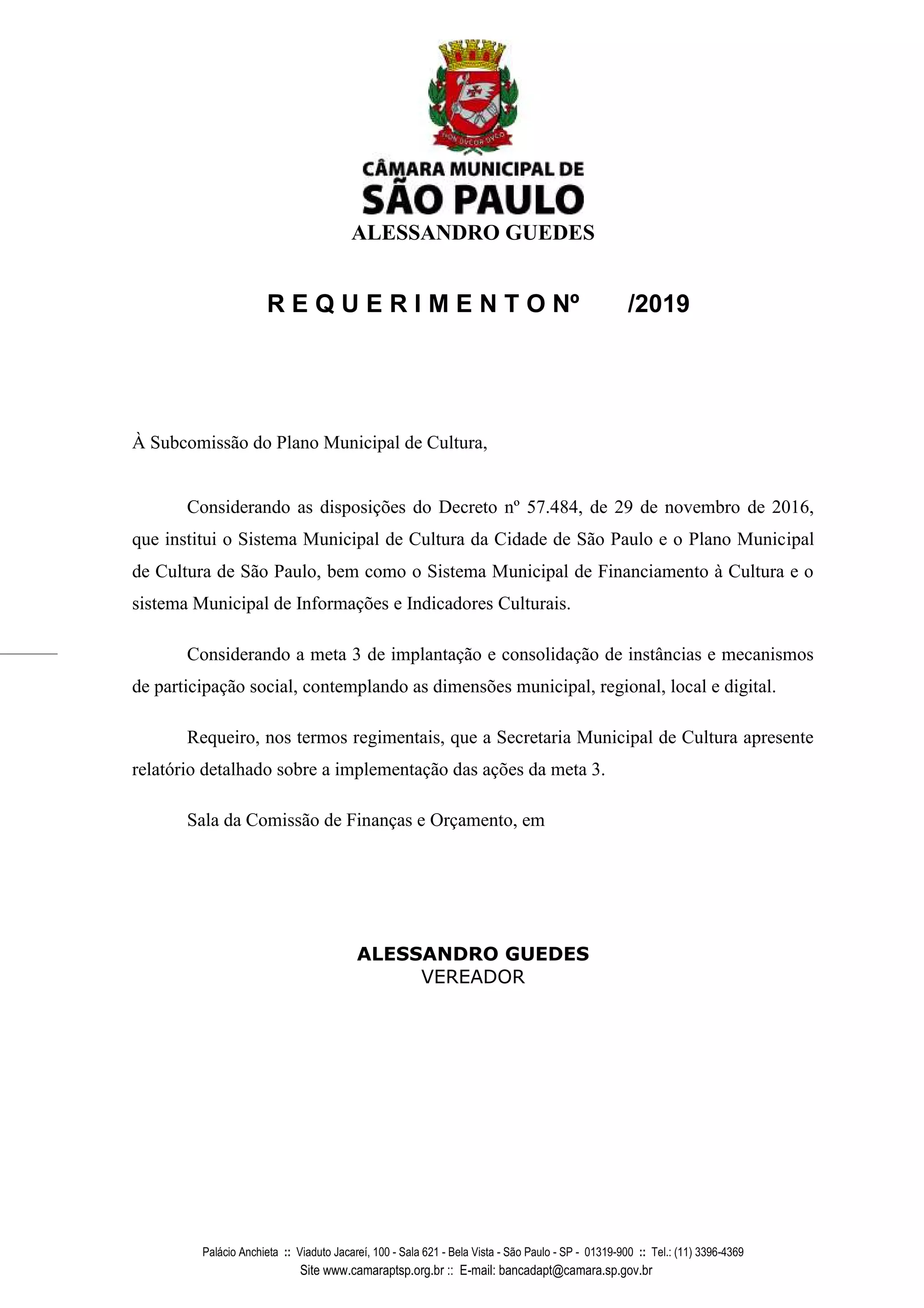 O vereador Alessandro Guedes requer à Subcomissão do Plano Municipal de Cultura que a Secretaria Municipal de Cultura apresente um relatório detalhado sobre a implementação das ações da meta 3 do Plano Municipal de Cultura, que trata da implantação e consolidação de instâncias e mecanismos de participação social.