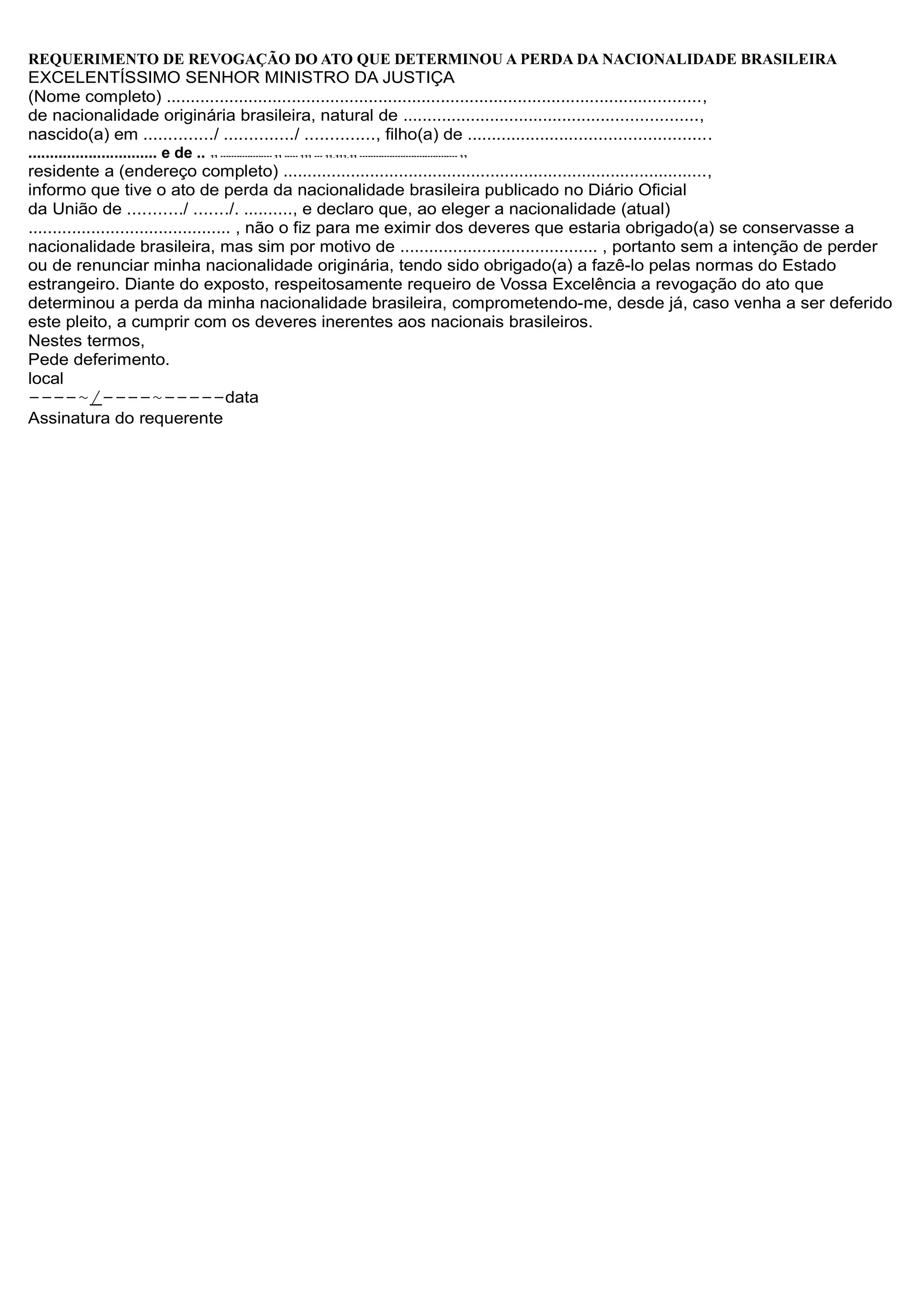 O requerente pede a revogação do ato que determinou a perda de sua nacionalidade brasileira. Ele afirma que ao adquirir outra nacionalidade o fez por motivos de [motivo específico], sem a intenção de perder a nacionalidade brasileira, e se compromete a cumprir os deveres de cidadão brasileiro caso o pedido seja deferido.