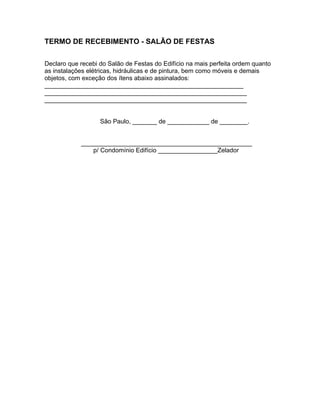 O documento é um termo de requisição para o uso do salão de festas do condomínio pelo morador. Ele detalha: 1) As responsabilidades do morador em relação ao uso do salão, incluindo não perturbar outros moradores. 2) O compromisso do morador em deixar o salão limpo e em boas condições após o uso. 3) A assinatura do morador requisitante e do síndico autorizando o uso do salão na data solicitada.