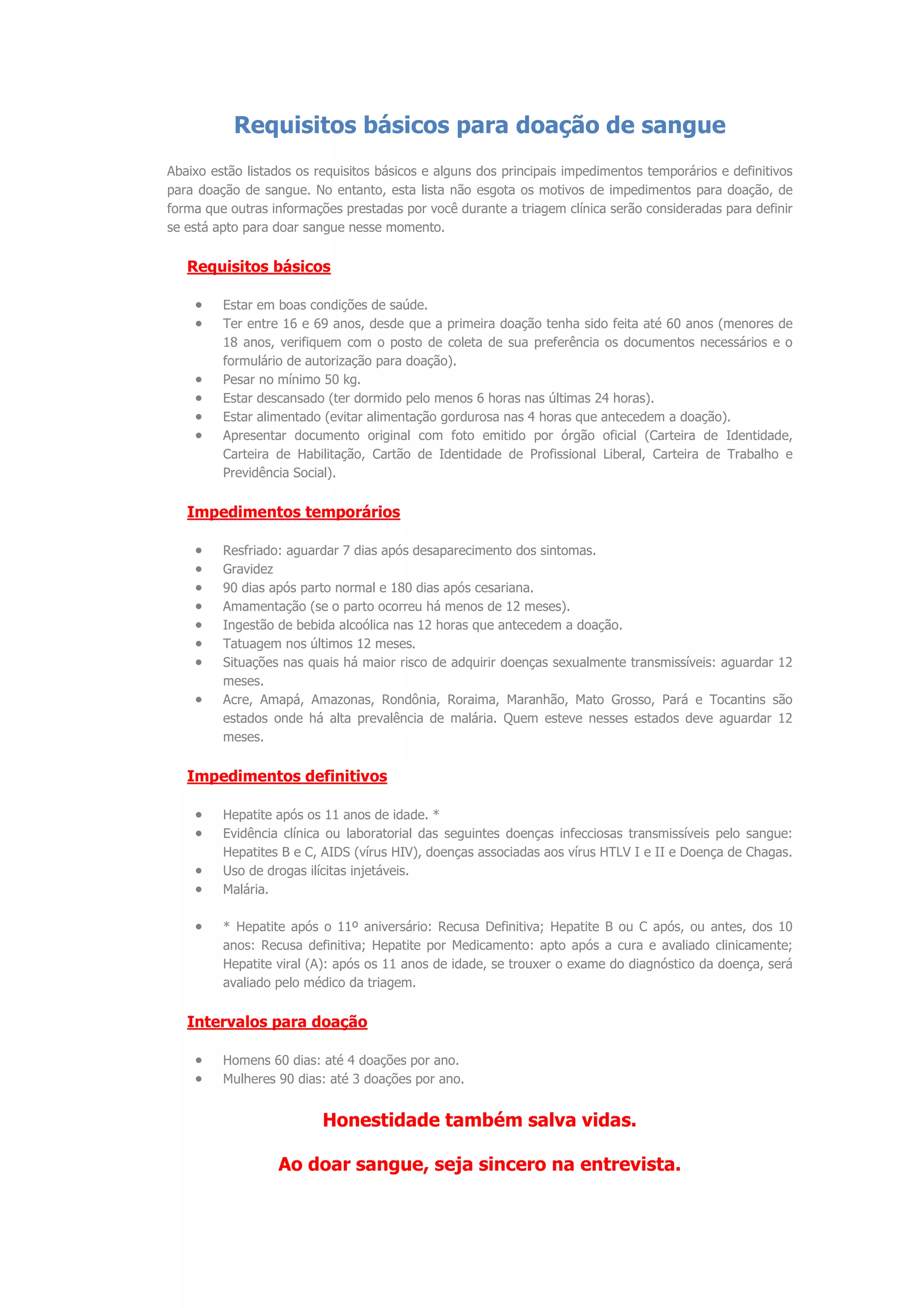 Este documento lista os requisitos básicos e impedimentos para doação de sangue, incluindo: estar entre 16-69 anos e pesar pelo menos 50kg; impedimentos temporários como resfriado e tatuagens recentes; e impedimentos definitivos como hepatite e doenças infecciosas.