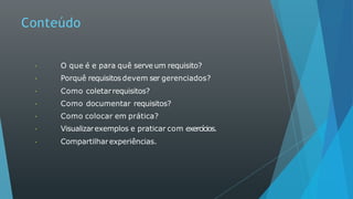 Este documento fornece diretrizes sobre gestão de requisitos de software, discutindo tópicos como coleta de requisitos, documentação, exemplos de requisitos funcionais e não funcionais, e boas práticas para elicitação e especificação de requisitos.