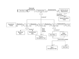 3) Princípios como temas de investimento, épicos, features e estórias de usuário são usados para guiar o desenvolvimento de acordo