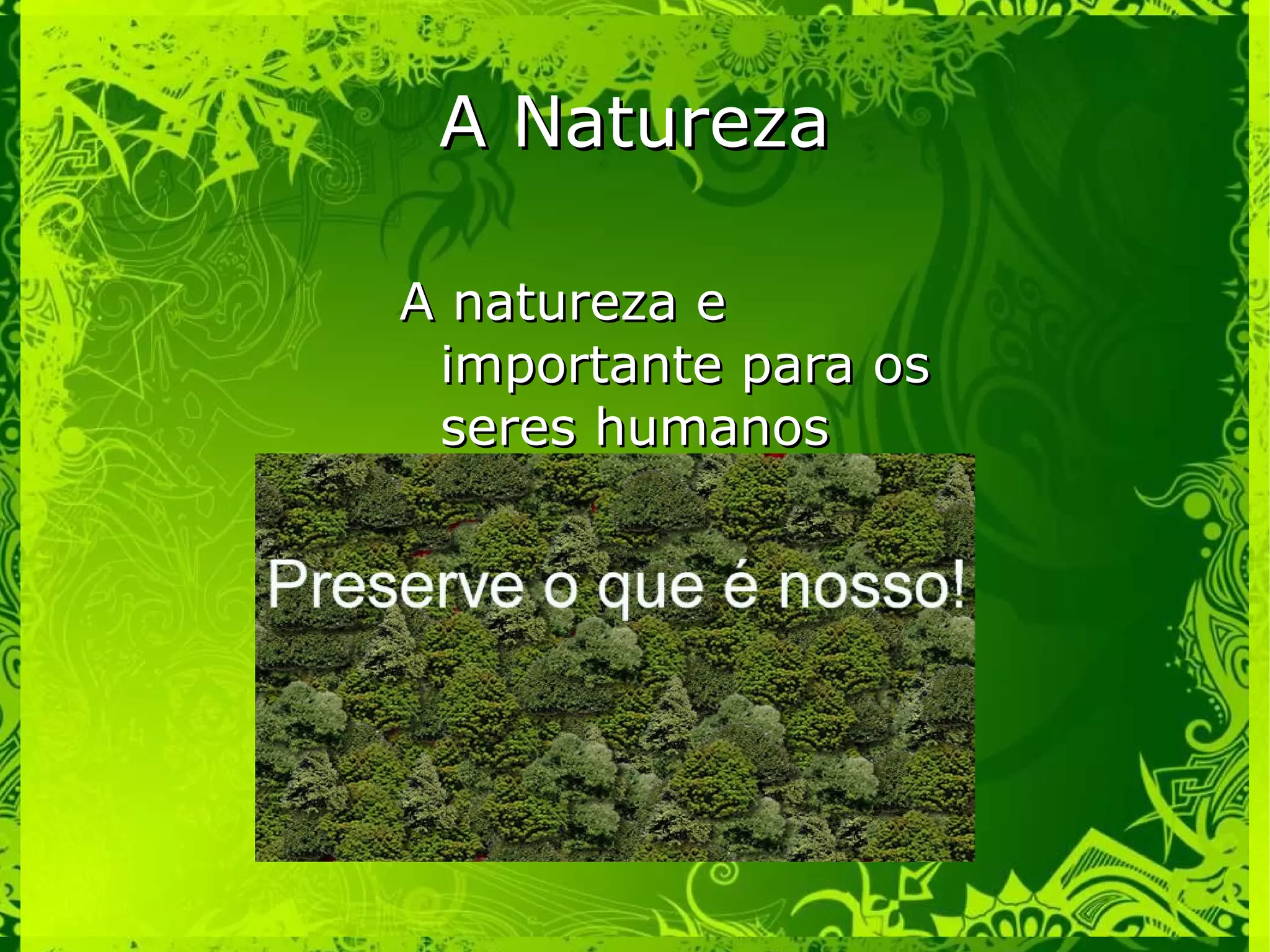 A natureza é importante para os seres humanos. Ela fornece recursos essenciais para nossa sobrevivência e bem-estar. Devemos proteger o meio ambiente para as gerações futuras.